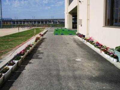 学校運営協議会の皆様が、卒業式前に体育館玄関前に移動していたプランターを整理して、児童昇降口へ向かう通路沿いに並べてくださいました。両側に花が並びとても美しいフラワー道路!歩くと心が弾みます