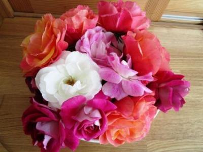 摘み取った花を中学校の多田隈先生が生けてくださいました。薔薇のケーキのようです。辺りはとてもいい香り