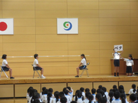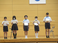朝の児童集会は、保健委員会の発表でした。発表では、話を聞く姿勢についての約束「背筋をピン」「足は床にベタ」「話している人の方をジーと見る」についてとトイレのスリッパ並べについてありました。ステージ上でピン、ベタ、ジーのお手本の姿勢を椅子に座って見せてくれました。トイレのスリッパ並べでは、スリッパを並べることで心を揃えるという話しもしてくれました。昼休み後のトイレのスリッパを見に行くと、どこも綺麗に並んでいました。保健委員会の皆さんありがとうございました。