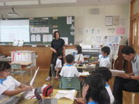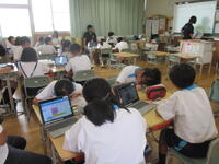 5年2組で算数「整数の性質を調べよう」の研究授業がありました。東海道新幹線の座席の数に関する問題で、通路の両側に2人がけの列と3人がけの列が並んでいることについて、今まで学習した整数の性質を活かしながら考えていきました。タブレットを使ったり、図に描いたりしながら学習を進めました。最後に2の倍数と3の倍数の性質に気づき、座席の工夫に驚いていました。落ち着いた雰囲気の中で進められた授業でした。