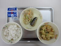 給食のメニューは、麦ごはん、牛乳、スーミータン、ピリ辛いため、キャベツのレモン酢あえでした。スーミータンは中華風のコーンスープのことで、「スーミー」がとうもろこし、「タン」がスープという意味だそうです。溶き卵が落としてありました。