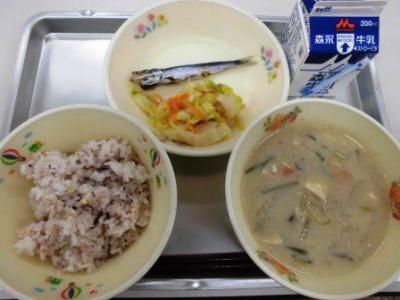 温かい呉汁に雑穀ご飯、白菜漬け。めざしは、養護教諭曰くパンチの効いた味でした
