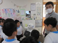 今日、玉名市教育委員会から貸し出しされたソフトバンク株式会社のペッパーロボットが届きました。子どもたちのプログラミング的思考や技能を高めるために活用します。明日から15日(金)まで、あいさつ運動や授業、クラブ活動などの時間にペッパー君と一緒に学習していきます。写真は、職員と会話をしているペッパー君の様子です。