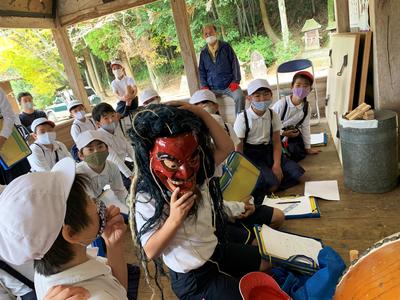 先週金曜日、4年生が校外学習で、山部田熊野座神社で神楽の歴史を、梅林天満宮で流鏑馬の歴史を学びました。実際に見たり触れたりする道具に目を丸くしたり、重い装具を身につけて踊る苦労を伺ったり、実際に神楽舞いを務めている友達の舞いを見たりと、貴重な学習ができたようです。今日の熊日新聞にも大きく取り上げられていましたね。今年は感染症の関係でお祭り自体は中止のところが多いですが、しっかり学び地域の跡取りが育っています