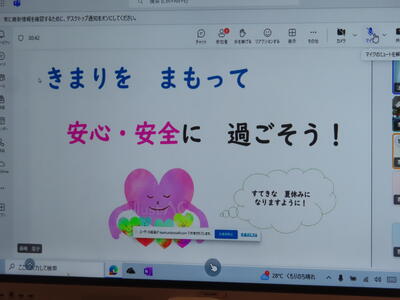 7月18日(金)オンラインでの集会を開きました。集会では、前期前半、子供たちが頑張ったことを振り返りました。長い休みになりますが、命を守る指導をしました。みんなが元気に登校する日を楽しみにしています。