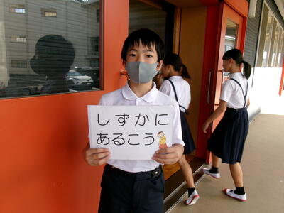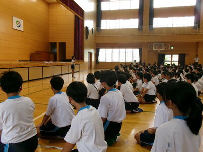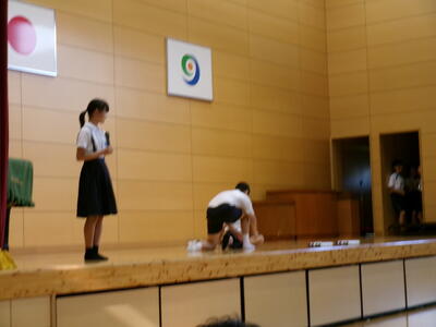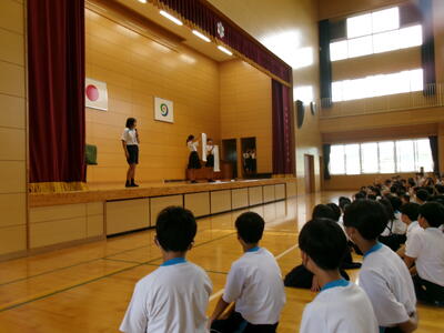 9月9日は、救急の日です。それにちなんで、保健委員会が、けがの処置の仕方について発表しました。「すりきず」「鼻血」「つきゆび」など、身近なけがについてみんなで考えました。ほとんどの児童が、対処の仕方を知っていましたが、「鼻血」の時は、鼻をつまみ下を向くや「血が出た」時は、心臓より上にあげるを知らない子が多かったようです。寸劇を交えた分かりやすい、楽しめた発表でした。運営委員会のみんなも落ち着いた集会になるよう活躍しています。