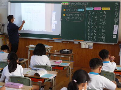 【かけ算の九九・・・2年 算数】2年2組では、かけ算(5の段)の学習をしていました。しっかり先生の話を聞いて、丁寧にノートに書いていました。