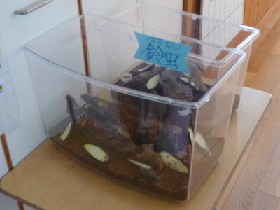 ※ 2年生教室前で、秋を感じさせる涼しげな音が聞こえてきました。正体は、「鈴虫」でした。