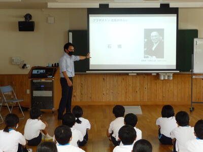 児童集会の前に、オンラインで全校児童に自己紹介をされました。