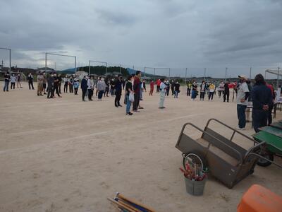 9月18日(日)、昨日は早朝7時から小中合同PTA美化作業が行われました。保護者及び学校運営協議会の方には、時折小雨も降る中、除草作業にご協力いただき感謝申し上げます。綺麗に整備された運動場で、10月2日(日)の運動会を迎えたいと思います。