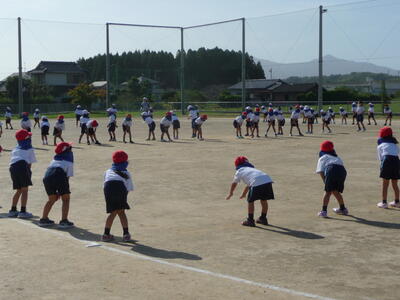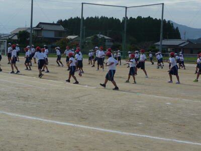 【金栗タイム 再開】朝の時間に、子どもたちが運動場に出て運動場を走る「金栗タイム」を再開しました。運動会に向けて少しずつ体を慣れさせることを目的にしています。