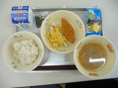 ※今日の給食メニュー・・・麦ごはん、けい飯のスープ、一食のり、けい飯の具、パイナップル、ホキのカリカリあげ、牛乳(けい飯は「鶏飯」と書き、奄美大島の郷土料理です。