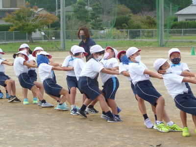 【運動会に向けて 綱引き・・・3・4年】運動会で、3・4年生は、赤白分かれて綱引きをします。今日の体育では、入場から競技、退場まで練習していました。