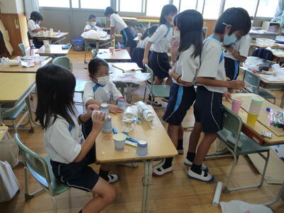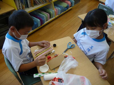 【うごくおもちゃ・・・2年2組 生活科】段ボールや紙コップ、ストローなどを使って、自分のアイデアで「動くおもちゃ」を作っていました。一人一人がとても楽しそうに作ってい
