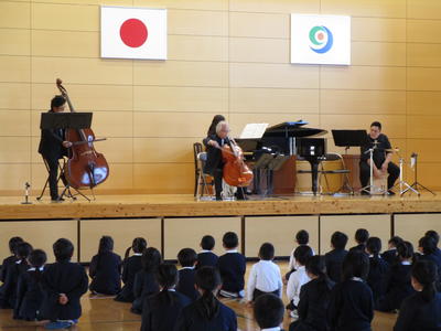 玉名市音楽アウトリーチ事業を利用させていただき、「リヴィエール」の4名の皆様をお招きしてスクールコンサートを実施しました。楽器はピアノに加えてパーカッション、チェロ、コントラバス。クラッシックのカノンや白鳥、アニメのトトロや魔女の宅急便の曲、最後には本校の校歌も演奏していただき大喜びの子供たちでした途中の楽器紹介では、マーチングの実演やコントラバスを弓で弾かせてもらったりと、密度の濃い時間になりました。感染症拡大防止のために3・4時間目に分けての実施でしたが、あっという間の楽しいひとときでした