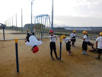 外では鉄棒、雲梯、登り棒。頑張れ!