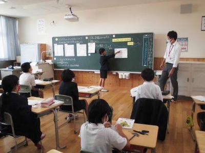 初任1年目の井上先生は、毎週、教師として必要な学びを得る初任者研修を受けています。講師は拠点校指導教員の先生(玉名町小配置)と本校職員です。今日は初任者研修の成果を検証する第1回目の研究授業が行われました。算数「垂直・平行と四角形」の単元、第3時「平行の意味を知り、その弁別ができる」内容でした。教材研究を経て教具の準備も行い、落ち着いて授業を進められました。子どもたちも、問題に意欲的に取り組み、平行の概念をつかんでいきました。子どもの声がたくさん出た良い授業であったと思います。課題もありますが今後さらに研修を積むことで乗り越えていけることでしょう。お疲れ様でした