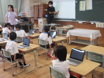 1年1組では、ICT支援員さんと一緒に、eライブラリの使い方を学習していました。タブレットの使い方がとても上手になっています。