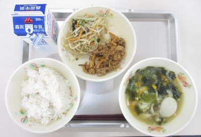 今日の給食メニューは、麦ごはん、牛乳、トックスープ、ビビンバ、ナムルでした。トックスープは、韓国でお正月に食べられるお雑煮風にした料理です。「トッ」は餅、「ク」は汁という意味だそうです。