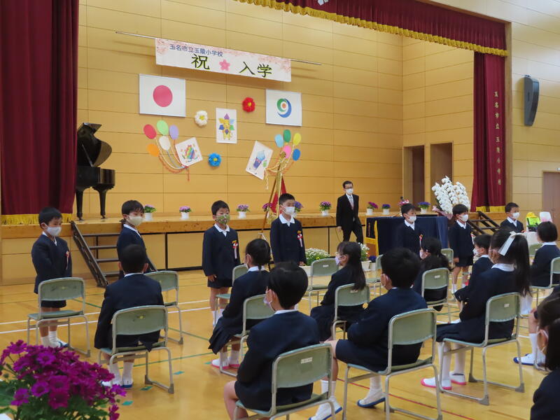 4月11日(月)、玉陵小学校の新しい仲間、新一年生62名の入学式を行いました。真新しいランドセルを背負い、保護者の方に手を引かれながら登校し、入学式に臨んでくれました。式の間は、新しい環境に戸惑いと緊張の様子が伺えました。しかし、自分の名前が呼ばれると、一人一人元気に返事をしてくれました。もう立派な玉陵小の一年生です。