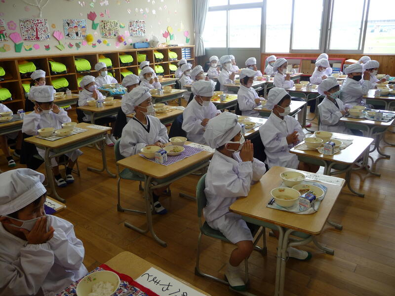 1年生にとっては、小学校で初めての給食となりましたが、食缶や牛乳を自分たちで運び、先生方に配膳してもらいながら用意をしました。