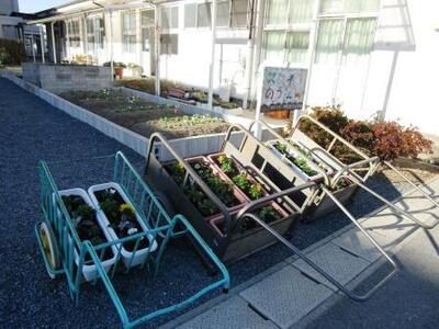 特別支援学級のプランターではエンドウ豆?やブロッコリー?がすくすくと。