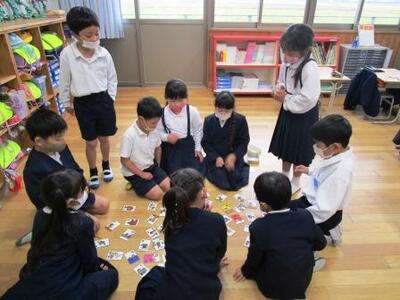 1年生は教室でカルタ遊び。