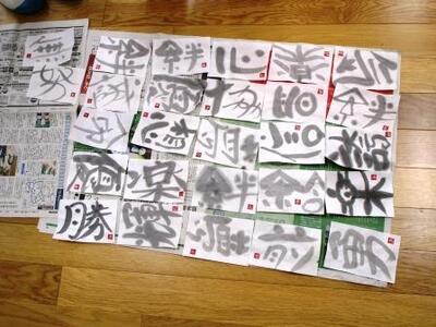 2組さんも、世界に一つのオリジナルの書ができあがりました。この後、剛山先生が裏打ちを施され、額に入れて卒業式会場に飾ります。楽しみ