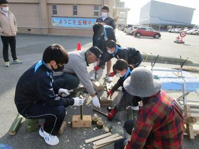 玉陵中の生徒会新執行部の初仕事、学校運営協議会の皆様にご指導をいただき門松づくりが行われました。