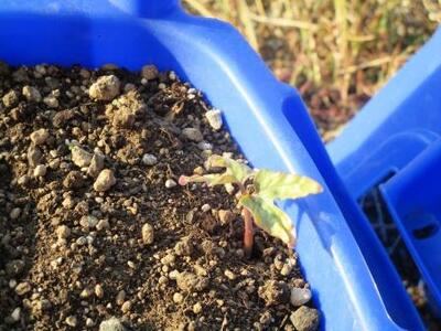 こぼれ種から出たアサガオさん。風邪引くよ-