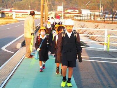 中学生は駅伝練習&修学旅行のため、小学生だけであいさつ運動を実施しました。今日は「栗崎・大坊」地区と運営委員の皆さんです。