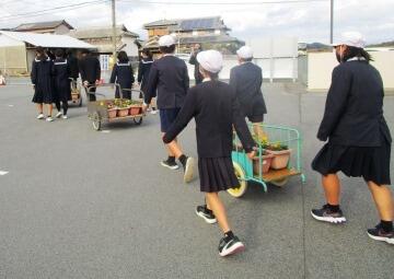 プランターをリヤカーに積みます。小学生のリヤカー、かわいいでしょ。