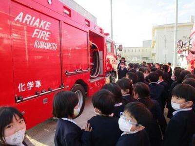 終了後、1年生は消防車の見学。国語の学習「自動車くらべ」の仕上げができました。ちなみにこの消防車は6千万円、他の2台はそれぞれ1億6千万円だそうです!