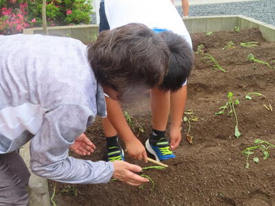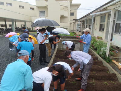 今日の4時間目に「さくら、たんぽぽ学級」の子どもたちが、中学校のお兄さん、お姉さんたちと一緒に学校の中にある「スマイルのうえん」にサツマイモの苗を植えました。雨が少し降るあいにくの天気でしたが、学校運営協議会の松川さん、高木さん、荒木さんの指導を受けながら一生懸命に植えていました。収穫が楽しみです。お世話も頑張ってください。写真は指導をしていただいた(向かって右側から)松川さん、高木さん、荒木さんです。