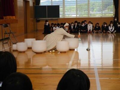 今日は玉名市の音楽アウトリーチ事業により本校体育館で音楽会を実施しました。おいでいただいたのは「ナノハナ」さん。白いクリスタルボールが中心のヒーリングミュージックを奏でてくださいました体育館いっぱいに広がる柔らかな響きに身も心もリラックスしました