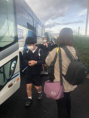 玉陵中1年2組が元気な挨拶でバス通学の子供達を迎えてくれました。