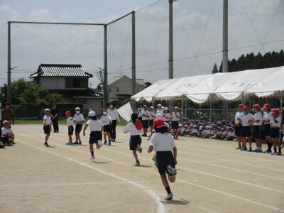 今日は、全体練習の2回目でした。昨日に引き続き、入場、開会式の練習をした後、退場、閉会式、紅白代表リレーの練習を行いました。1年生の開会の言葉、大きな声で上手にできています。また、紅白代表リレーでは、本番さながらに盛りあがっていました。本番が楽しみです。写真は、開会式の様子と紅白代表リレーの様子です。