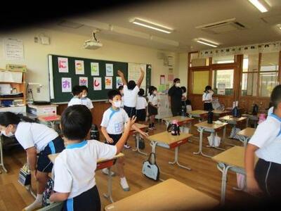 4年生までの下校。先生から「明日は、ちゃんと朝ご飯を食べてこなんよ!」「ハイ!」