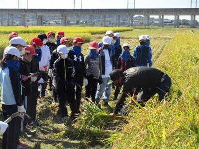 隣の田んぼでは稲刈りが…5年生も15日に体験させていただきます。お世話になります