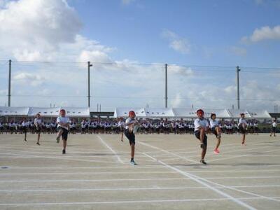 全体では紅白代表リレーの練習。低学年からバトンをつなぎます。
