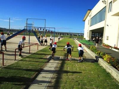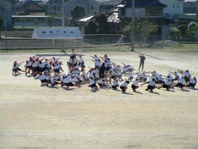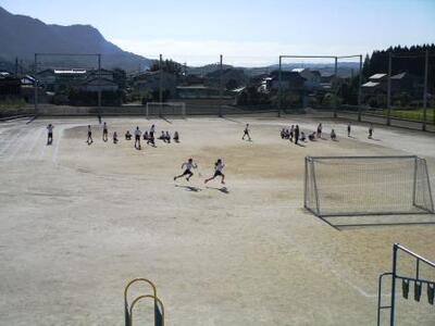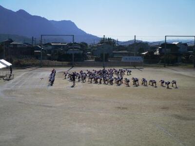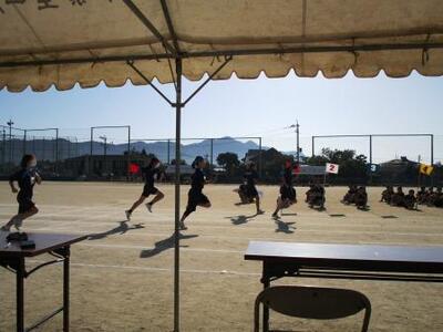 走る!走る!子供達。体育主任は、どんなに冷え込んでも毎朝半袖でライン引き後、高学年と一緒に走ります。すごい!