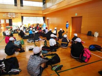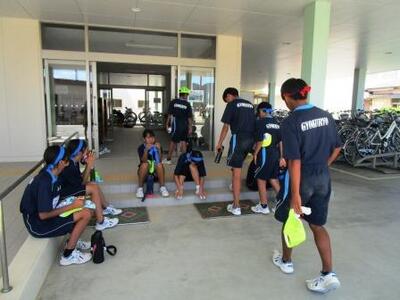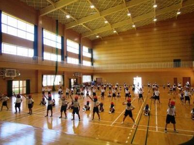 体育館ではラジオ体操の練習。のびたり曲げたり、様になってきました。