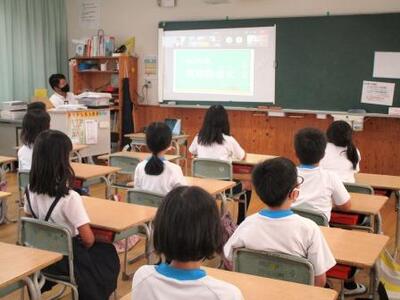 4の2では理科の授業。理科室での対面を避け教室で授業が行われています。3年以上の学力検査は理科、社会もあります。学習内容の定着をがんばっています。