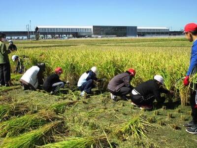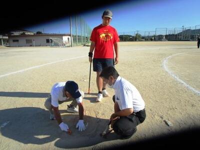先日の美化作業の続きを5年生と一緒にしていると、練習を終えた中学1年生が「こんにちは!」とあいさつをして整地作業に。
