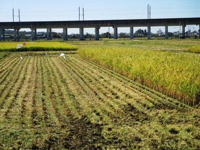 5年生の田んぼの稲が実を結び稲穂が垂れてきました。もうすぐ実りの秋。今日は白鷺が観察に来ていました
