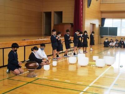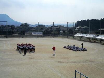 今朝はきれいになったグラウンドで小学生は朝遊び、中学生は体育大会の朝練が行われていました。感謝の気持ちをもたせます