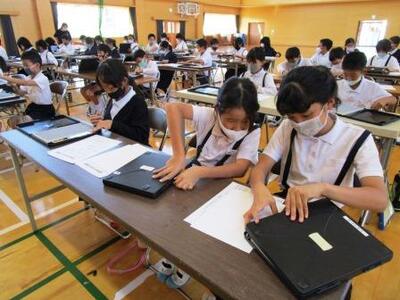 お隣の2組では、国語のローマ字の学習を活かして、タブレットのローマ字入力の練習。ホームポジションを確認し両手でできるとカッコイイ