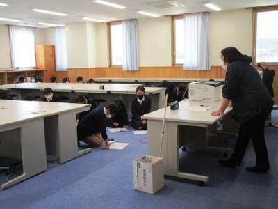 体育館ではグループ毎にタブレットの映像で動きを確認しながら玉陵ソーランの練習。だんだん様になってきました。