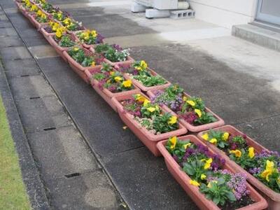 プランターのパンジーも寒さに負けず大きな花を咲かせて迎えてくれました。環境委員会のお世話でとても大輪に育っています。