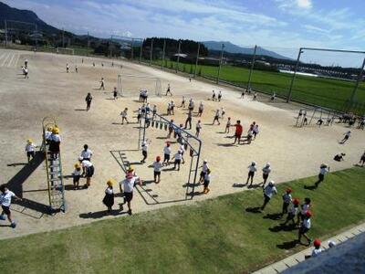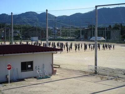 今朝はきれいになったグラウンドで小学生は朝遊び、中学生は体育大会の朝練が行われていました。感謝の気持ちをもたせます